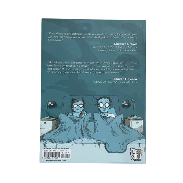Free Pass is an intoxicating tale of liberty, privacy, and shame, set in the sticky place where sex, politics, and technology come together.George Orwell said "You are free to be a drunkard, an idler, a coward, backbiter, a fornicator. You are not free to think for yourself."Huck and Nadia are enjoying their twenties: working in Big Tech and developing an adventurous sex life. Together they fantasize about opening their relationship with a "free pass" to sleep with certain friends or celebrities. It's all in good fun.But Huck is leading a double life. As a national election looms, he grows more and more uncomfortable with his company’s unelected authority over internet discourse.When the couple receives a bizarre gift — a cutting-edge humanoid sex AI that can morph into anyone — their worlds of fantasy, trust, and consent are thrown into blissful chaos.In a society growing more divided each day, Huck struggles with the pressure to uphold boundaries at work... while everything is collapsing at home.Julian Hanshaw follows his acclaimed graphic novels Tim Ginger and Cloud Hotel with an intoxicating new tale of liberty, privacy, and shame, set in the sticky place where sex, politics, and technology come together.